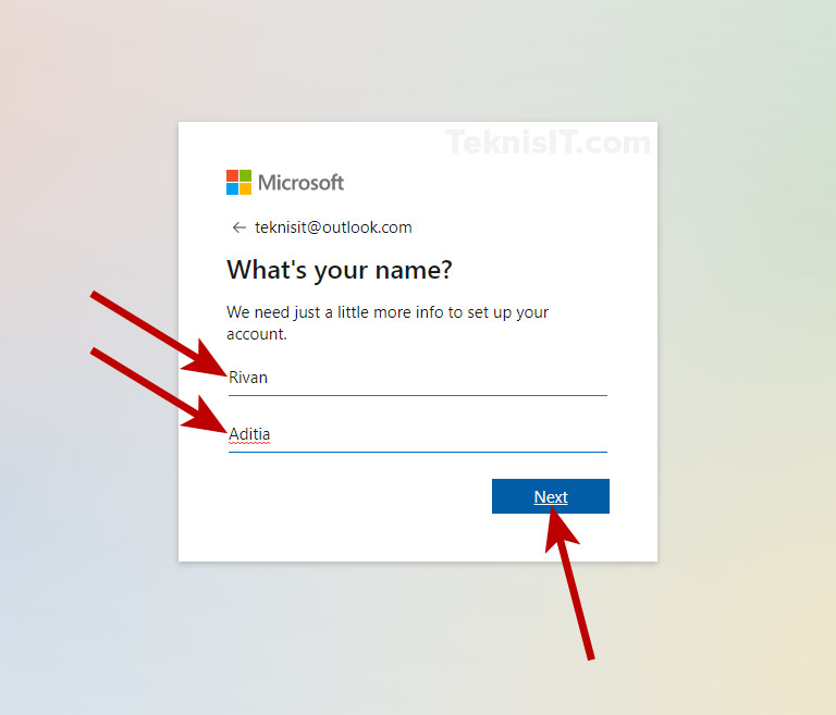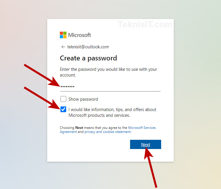 - Selanjutnya buat password akun Outlook. Kami sarankan dalam password mengandung unsur huruf kecil, huruf besar, dan angka. Tujuannya agar password lebih kuat dan susah ditebak oleh orang lain. Ceklis pada “I would like information, tips, and offers about Microsoft products and servicer” apabila Anda ingin mendapatkan informasi, tips, dan penawaran produk dan layanan Microsoft. Kemudian klik Next.