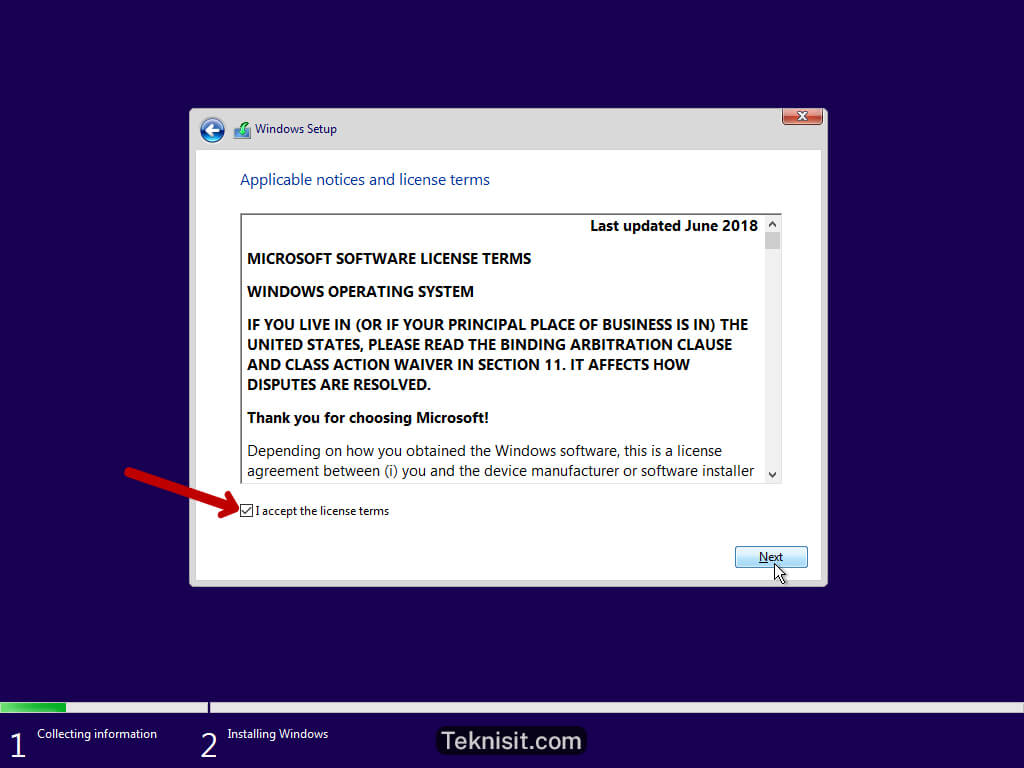 - Centang pada kotak I accept the license terms, lalu klik Next.