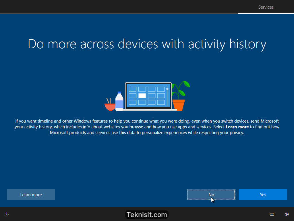 - Pilih No untuk tidak memunculkan histori aktivitas di Windows 10.