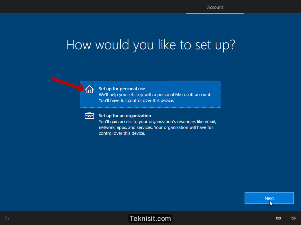 - Karena saya menggunakan Windows 10 untuk kebutuhan pribadi maka pilih Set up for personal use, lalu klik Next.