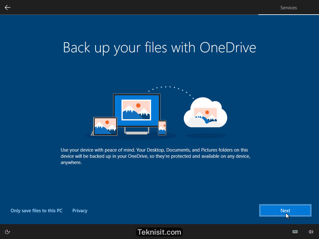 - Klik Next apabila ingin mengaktifkan OneDrive untuk keperluan backup data secara online. Jika tidak mau menggunakan OneDrive, klik Only save files to this PC.