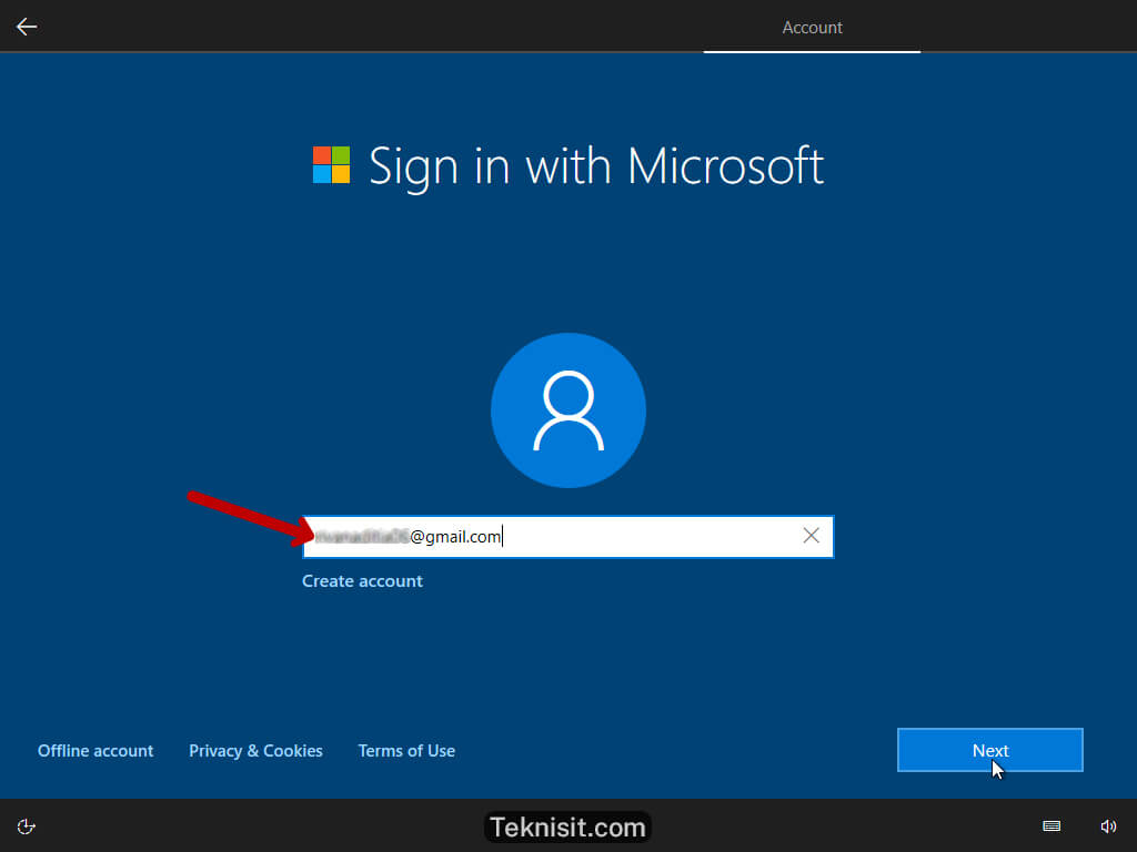 - Masukkan email akun Microsoft, lalu klik Next. Jika belum punya akun, silahkan buat dengan mengklik Create account. Apabila tidak ingin menghubungkan dengan akun Microsoft, silahkan klik Offline account.