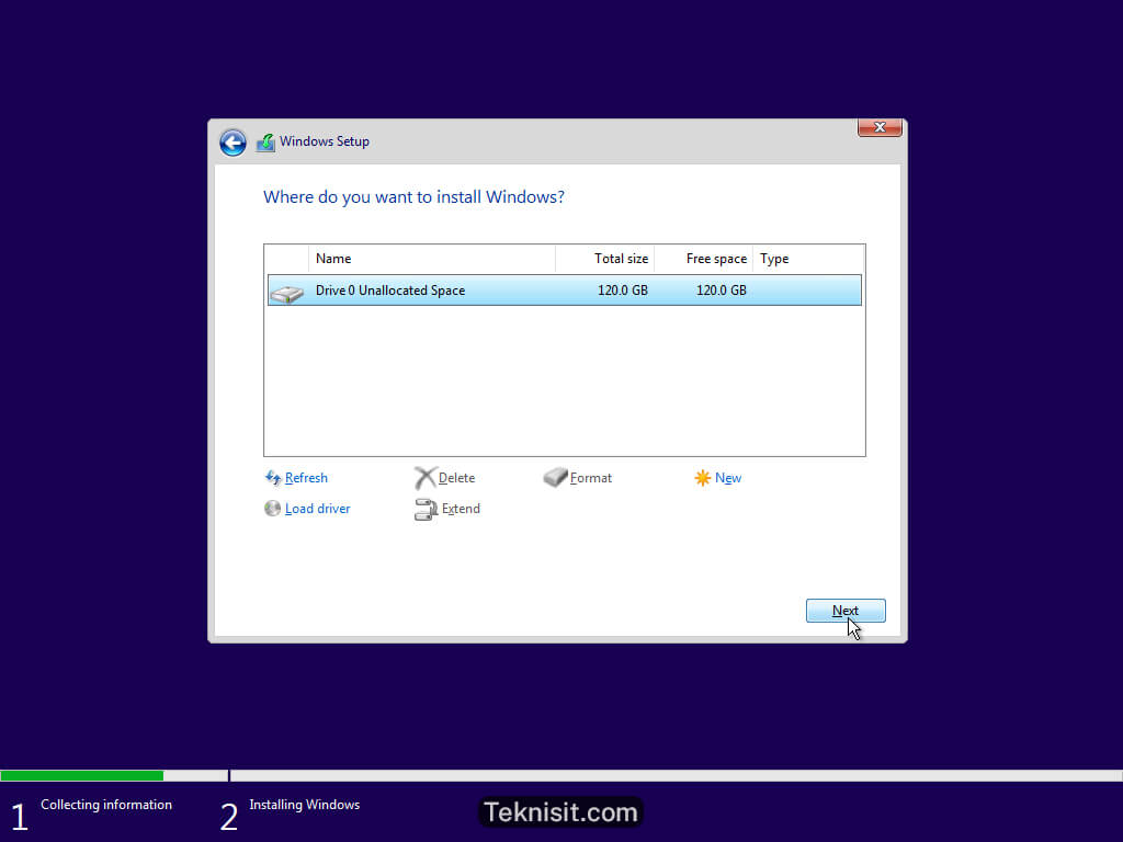 - Disini saya mempunyai SSD berukuran 120GB dan tidak akan saya partisi. Langsung saja klik Next.