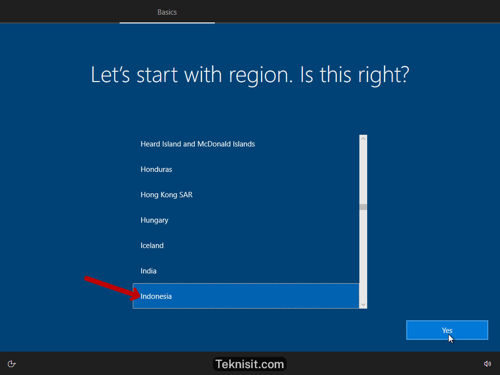 - Untuk lokasi pilih Indonesia, lalu klik Yes.