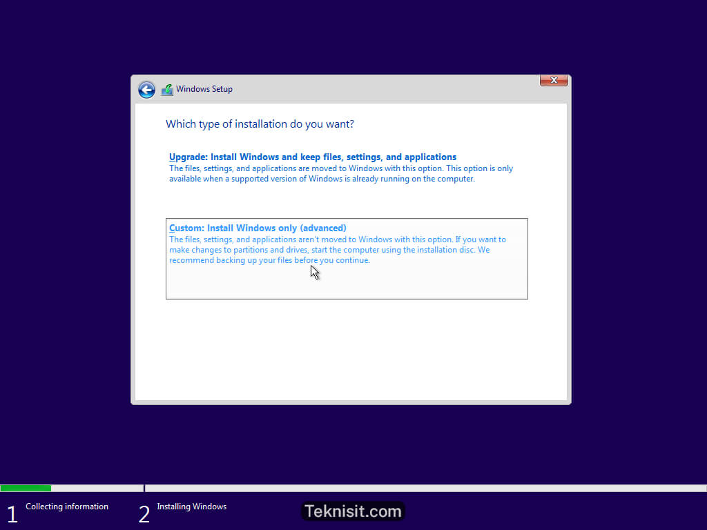 - Pilih Custom: Install windows only (advanced).